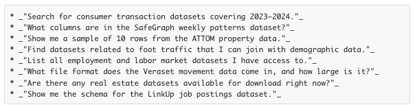 - Peruse and evaluate datasets. Browse dataset documentation, coverage details, and attributes directly in your AI tool, no tab-switching required.
